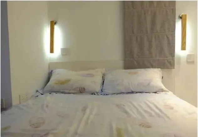 卧室里床头背景墙上两盏简约的壁灯照明,壁灯是可以调色温的,可明亮可温暖。床是定制的,床下都是收纳空间,没有大衣柜也收纳空间充足。